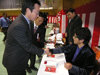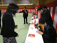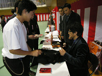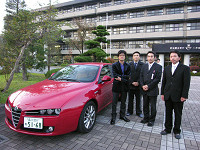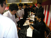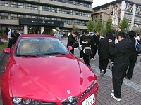 群馬県にて唯一自動車学科がある渋川工業高校の50周年記念の式典にて太田さんが講演会を行いました。講演前に準備をしていると、ある男子学生が「フェラーリでレースをしていたすごい人なんだ。事故があったけど、それから立ち直って、きょう来てくれたんだ」と友人たちに力説する姿が…。さて、きょうは太田さんと学生たちとどんな心の融合があるでしょうか。 渋川工業高校は、自動車科のほかにも機械科、電気科、情報処理科があり、職につなげる勉強をしている学生たちはしています。就職率も高いそうで、太田さんも「仕事」をひとつのテーマとして話していました。 「新しい会社に入ったとき、もしもイヤだなと思っても3年はめいっぱい頑張ってほしい。一生懸命やることで、自分を磨くことになるし自分に向いていることもわかってくるはず。君たちはいま、いわばダイヤの原石。磨かなければただの石ころ。でも、汚い石ころも磨けば光るし、痛くても頑張ってほしい」(太田さん) 終了後には体育館で全員で記念撮影とサイン会。そして、この日はアルファロメオ159@チェッカー号にて行ったので、終わった後は外に出て車を囲んでの記念撮影大会となりました。 取材・文/隠岐麻里奈