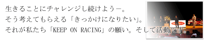 「KEEP ON RACING」のトレードマークとして使われている文字は、 事故から数ヶ月に太田哲也が左手で書いたものです。 その頃の右手は、やけどで腫れ上がり指を切断することも検討されたほど。 左手も少なからずやけどを負っており、当然利き手ではないから今まで文字など書いたことはなかった。 しかし、またレースをするんだという決意を込めて書いた文字なのです。